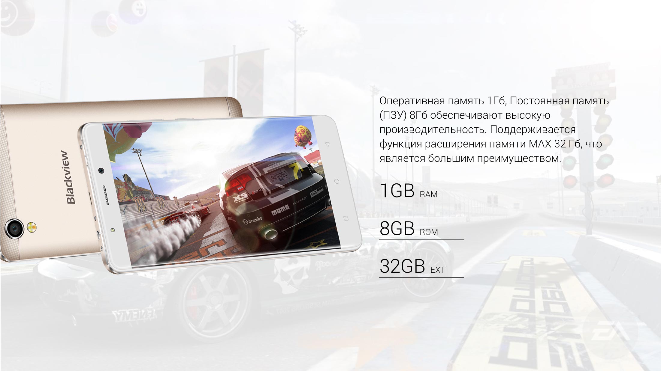 В качестве аппаратной платформы смартфона blackview a8 выступает mtk6580, производительности которой более чем хватит для среднестатистического пользователя. Объем оперативной памяти составляет 1 Гигабайт, а внутреннее хранилище данных рассчитано на 8 Гигабайт информации (с помощью карт памяти можно увеличить до 32 ГБ). Учитывая энергопотребление процессора mtk6580 и установленный на blackview a8 аккумулятор емкостью 2050 мАч, владелец может рассчитывать на то, что подзаряжать девайс потребуется раз в 2 дня.
